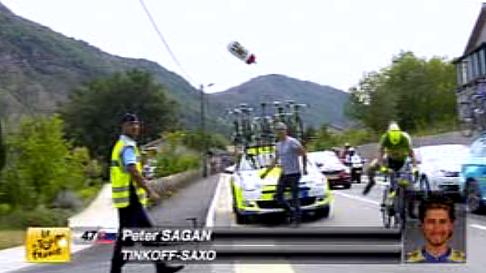 Jak se slovenský favorit Peťo Sagan blížil k obrubníku na pravém kraji cesty, televizní motorka ho stále sledovala a zastavila za ním. To znemožnilo přijet teamovému autu co nejblíže Saganovi a uskutečnit výměnu kol v co nejkratším čase. Peťo kopancem do kola motorky dal najevo motorkáři svou nespokojenost s jeho chováním a porušováním pravidel. Motorkář s kamerou poodjel o pár metrů dopředu, ale stále překážel Petrovi Saganovi, který po výměně stroje se nemohl plynule rozjet, musel kameru na motorce objet. Rozzlobený sportovní ředitel Sean Yates hodil po motorkáři cyklistickou láhev.